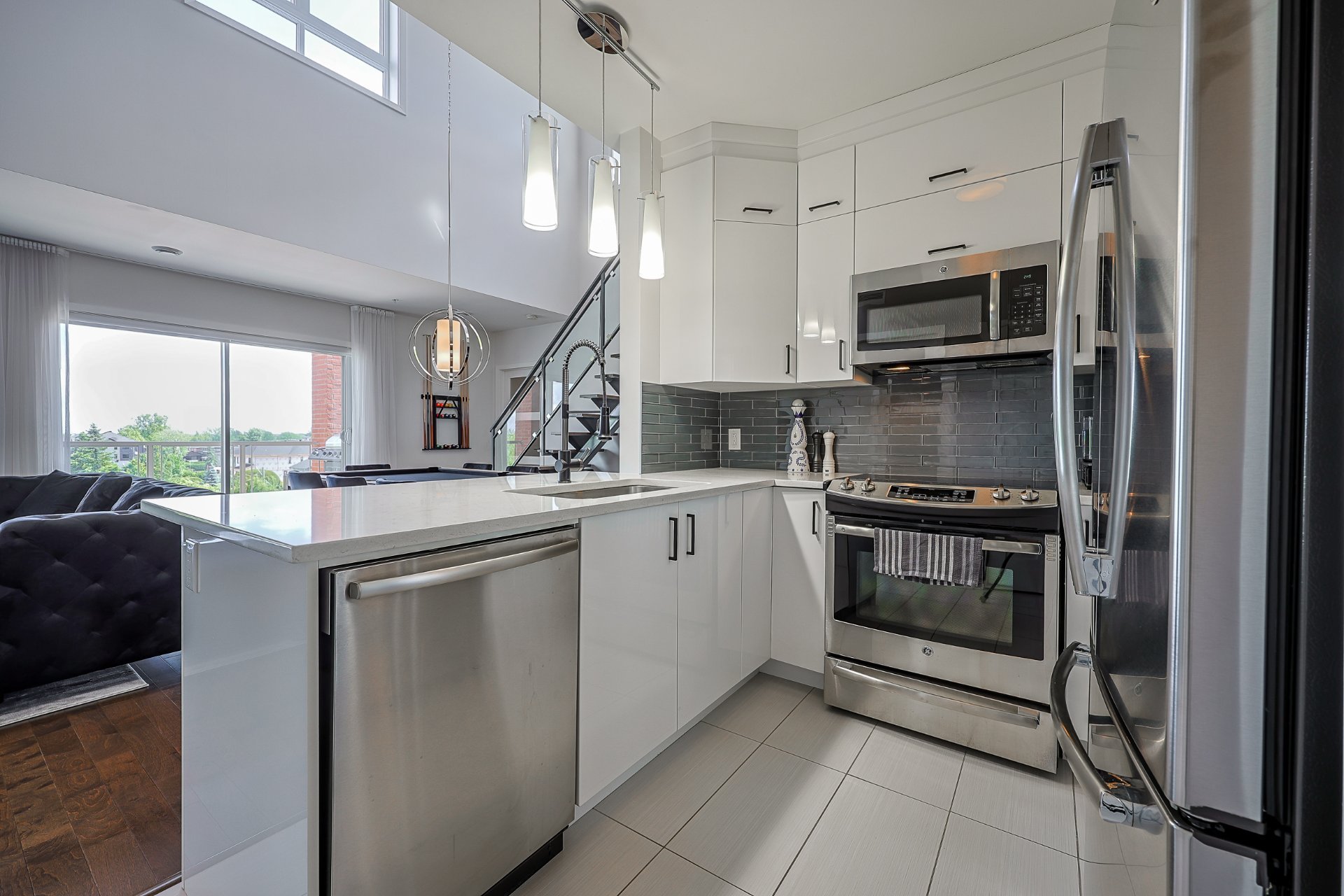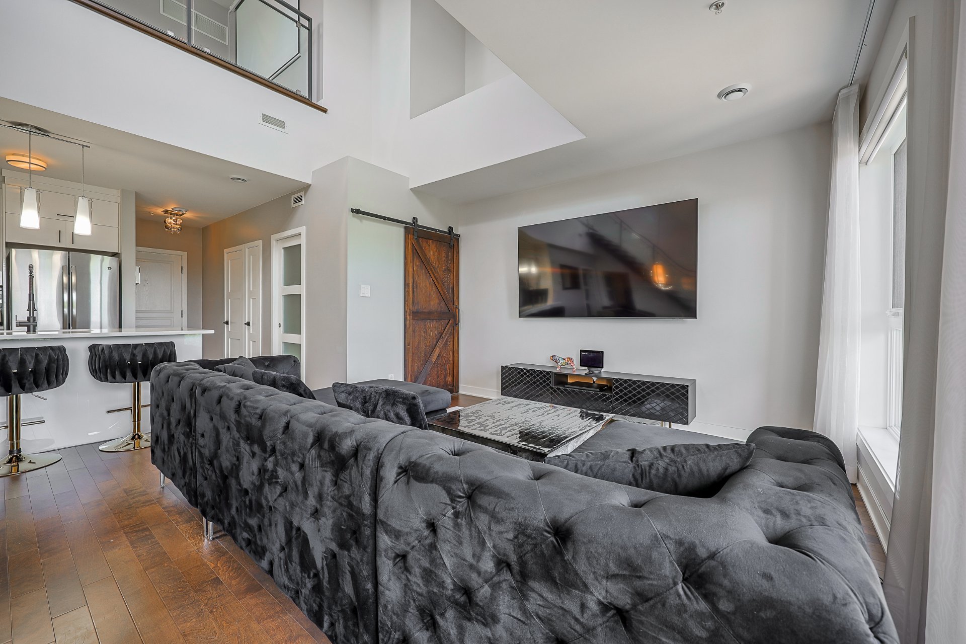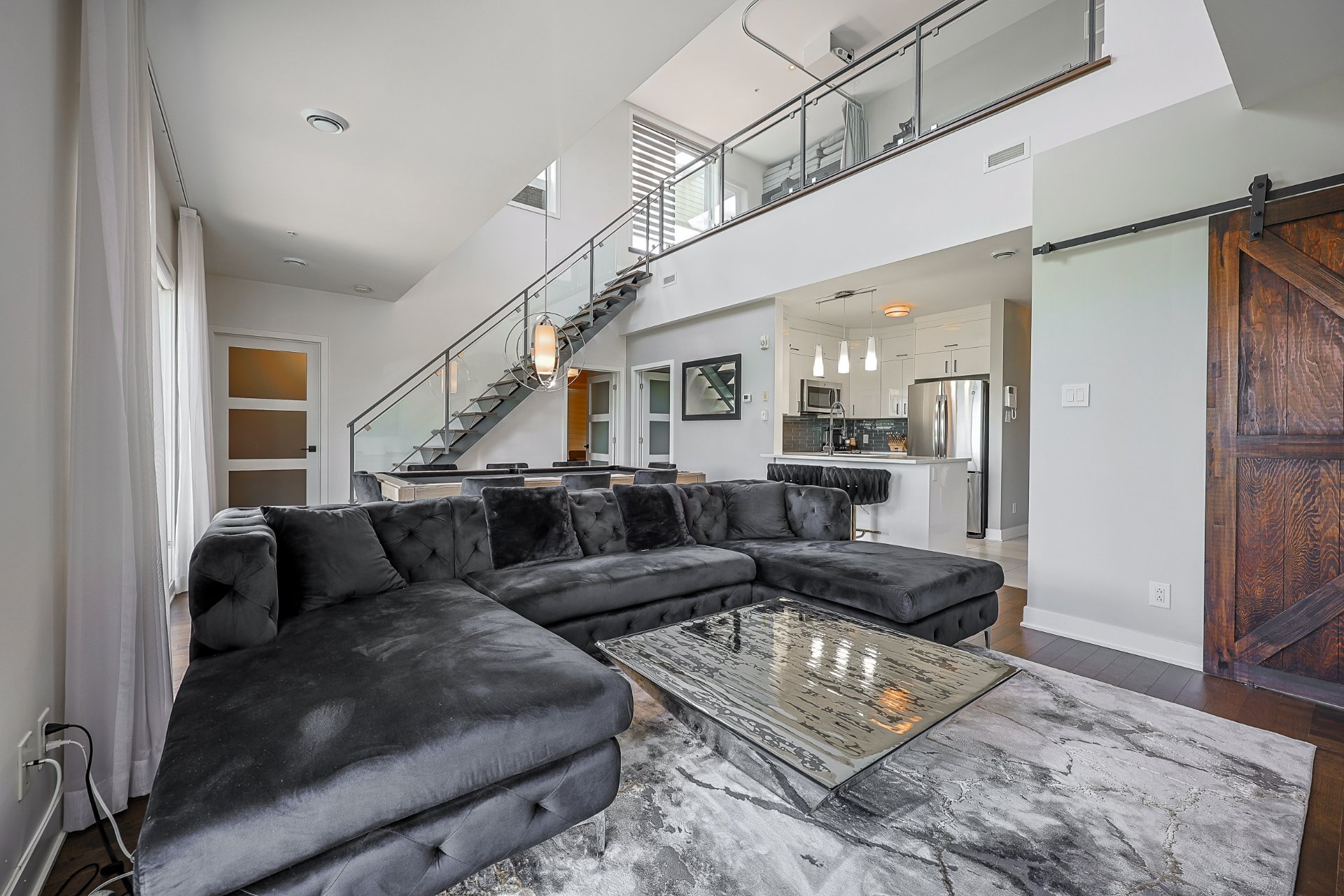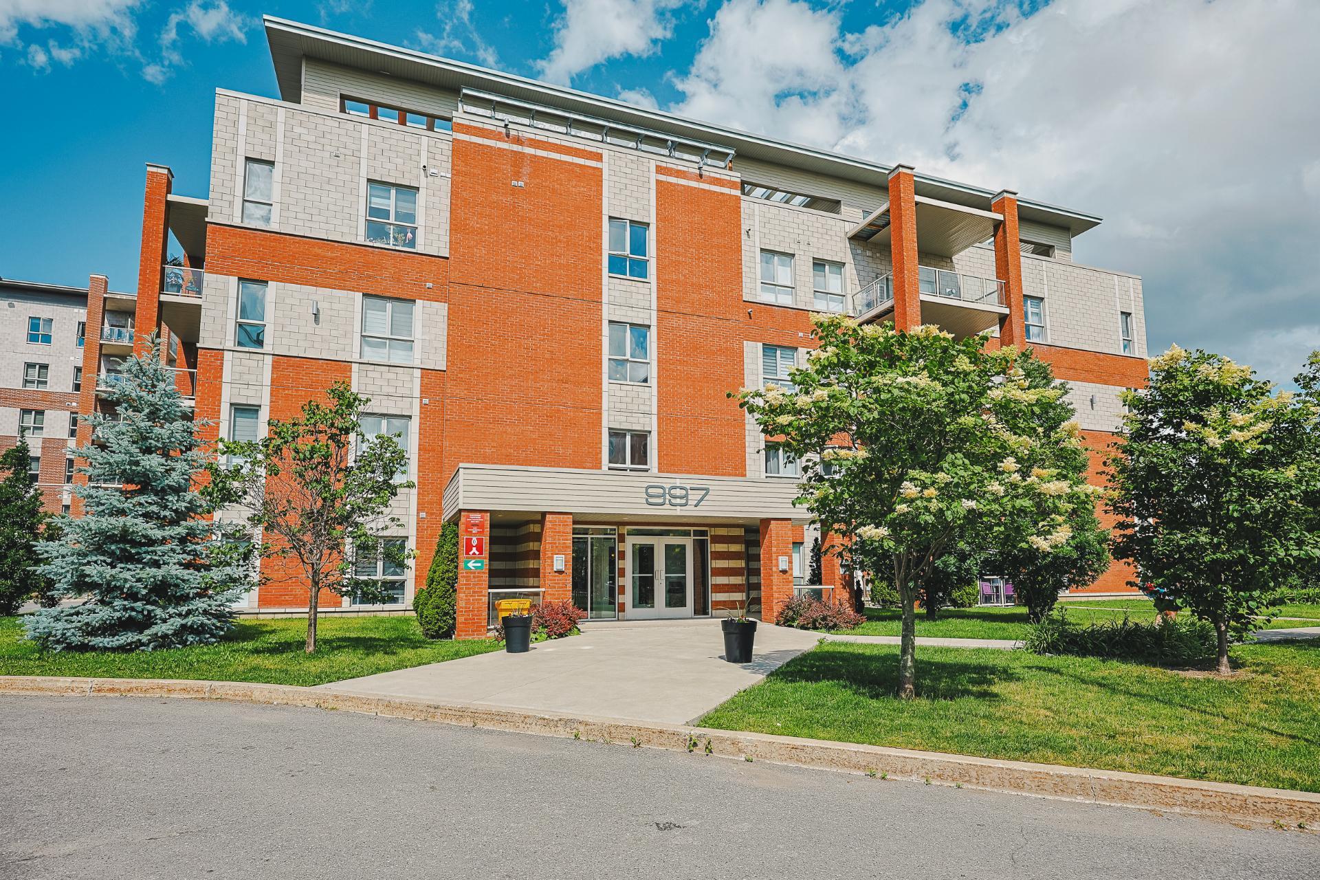 Stunning 2-bedroom condo, 2 garages with a mezzanine and private terrace featuring a spa. Open-concept design with 20-ft ceilings floods the space with natural light. Fully furnished, ready for immediate move-in. Secure complex offers a pool, gym, and garage with an electric car charging station. Elegant kitchen with quartz countertops, 2 modern bathrooms. Close to Méga-Centre Notre-Dame and Highway 13, just 5 min from Montreal. A must-see!