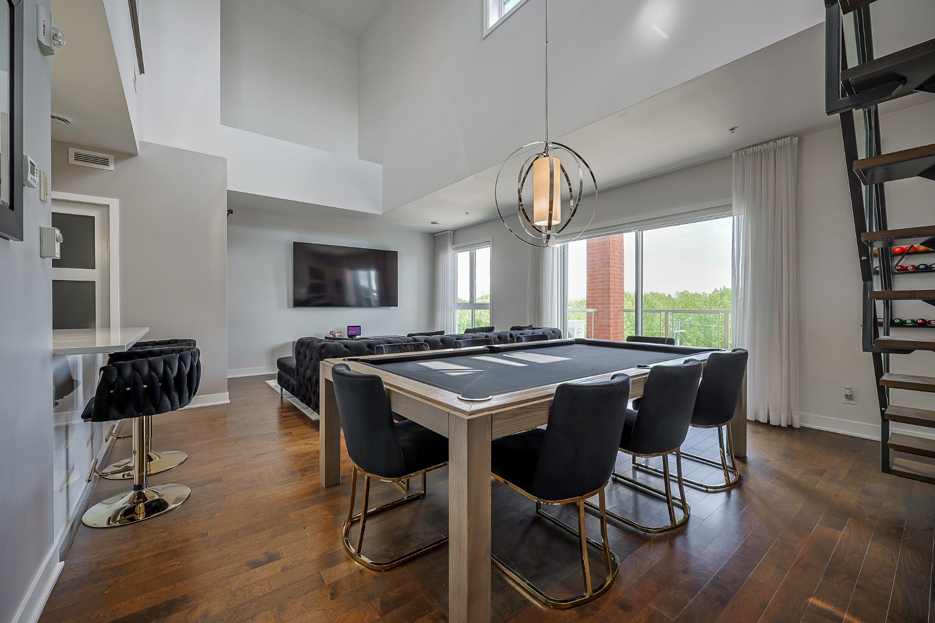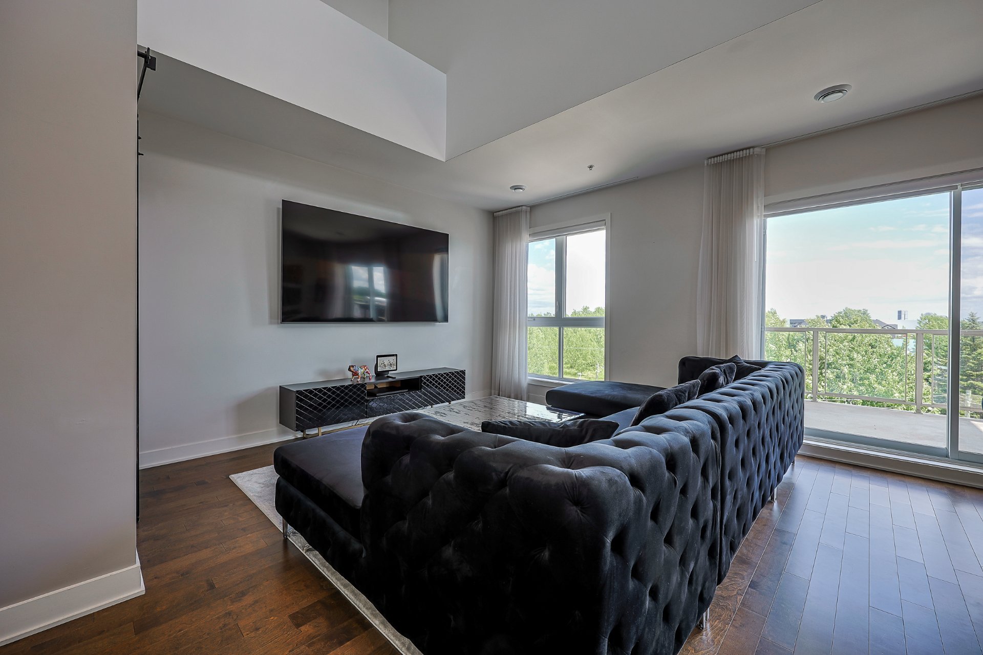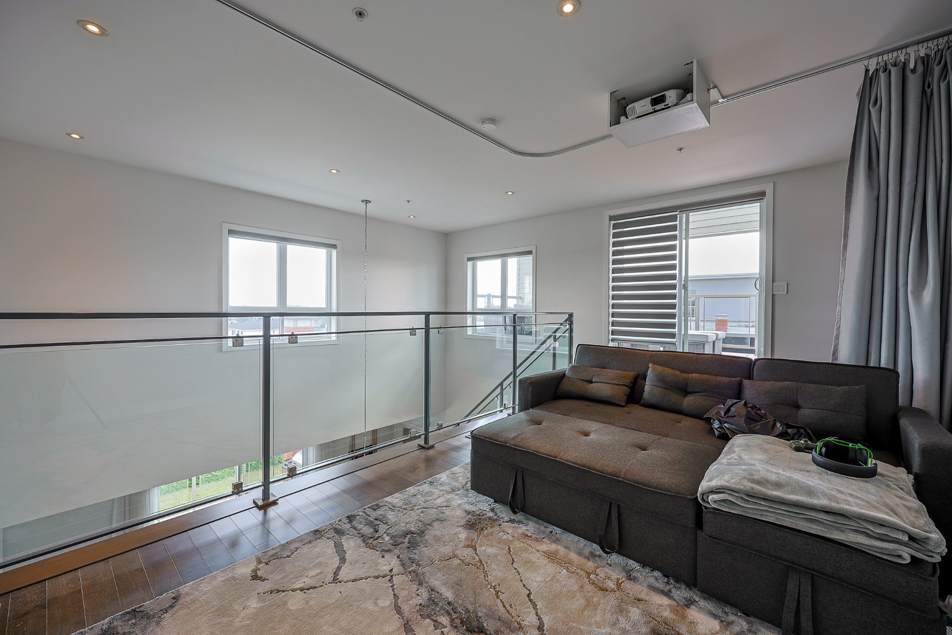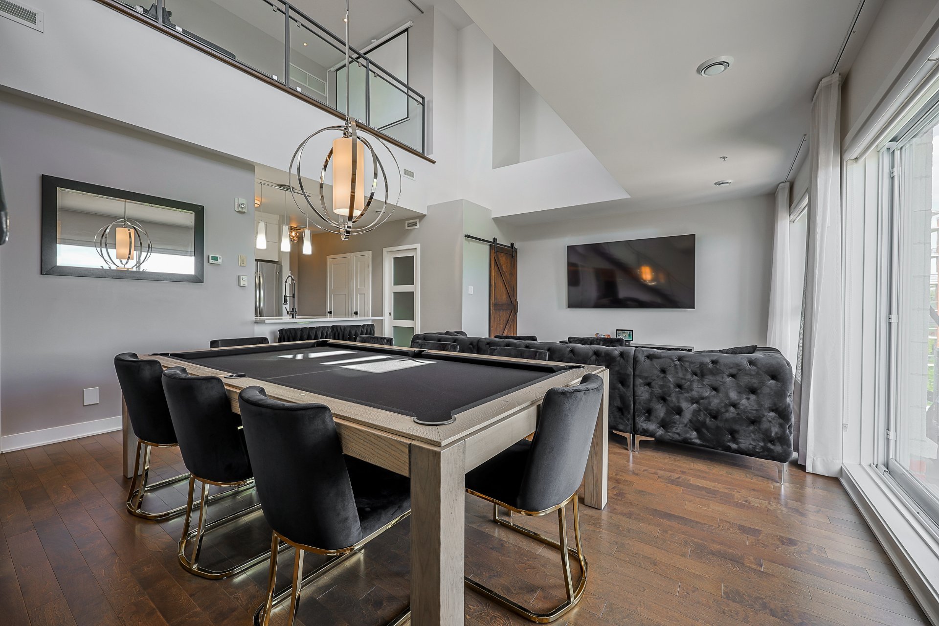 Stunning 2-bedroom condo, 2 garages with a mezzanine and private terrace featuring a spa. Open-concept design with 20-ft ceilings floods the space with natural light. Fully furnished, ready for immediate move-in. Secure complex offers a pool, gym, and garage with an electric car charging station. Elegant kitchen with quartz countertops, 2 modern bathrooms. Close to Méga-Centre Notre-Dame and Highway 13, just 5 min from Montreal. A must-see!