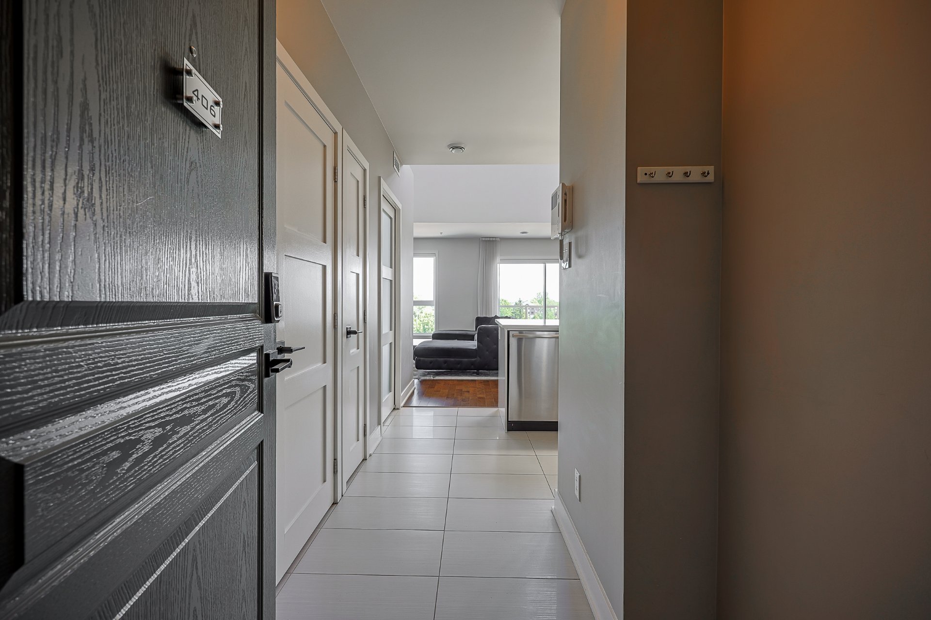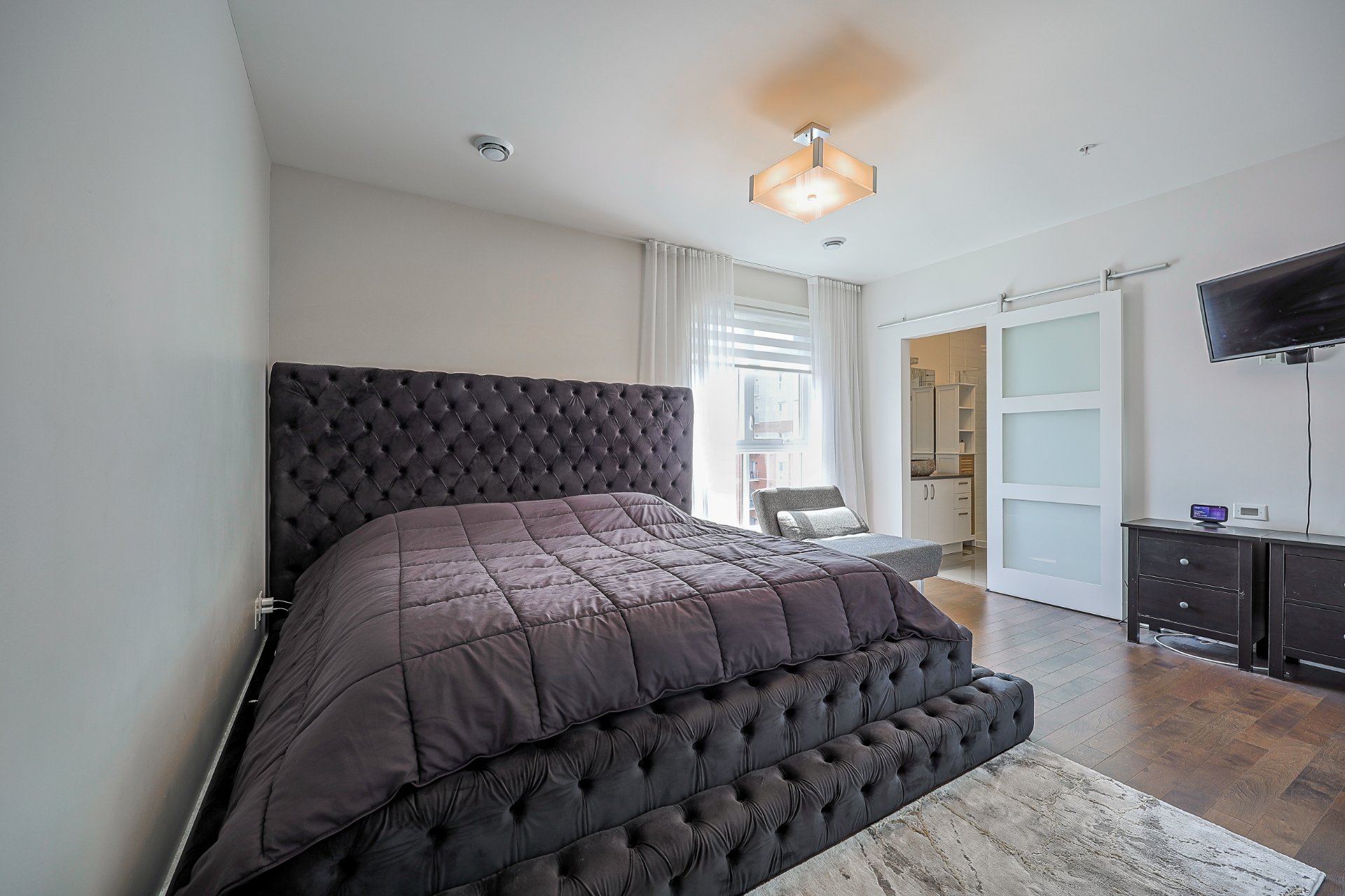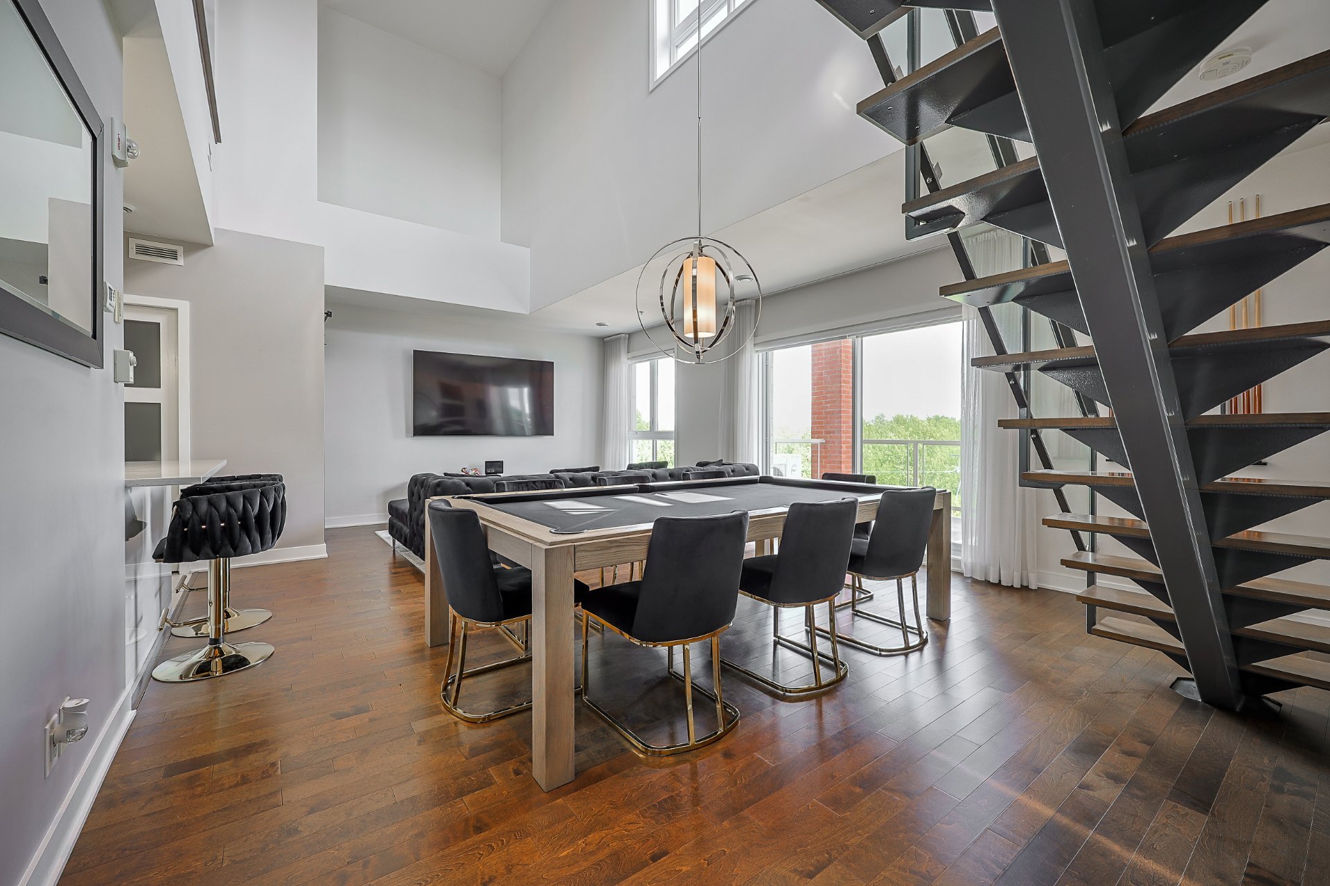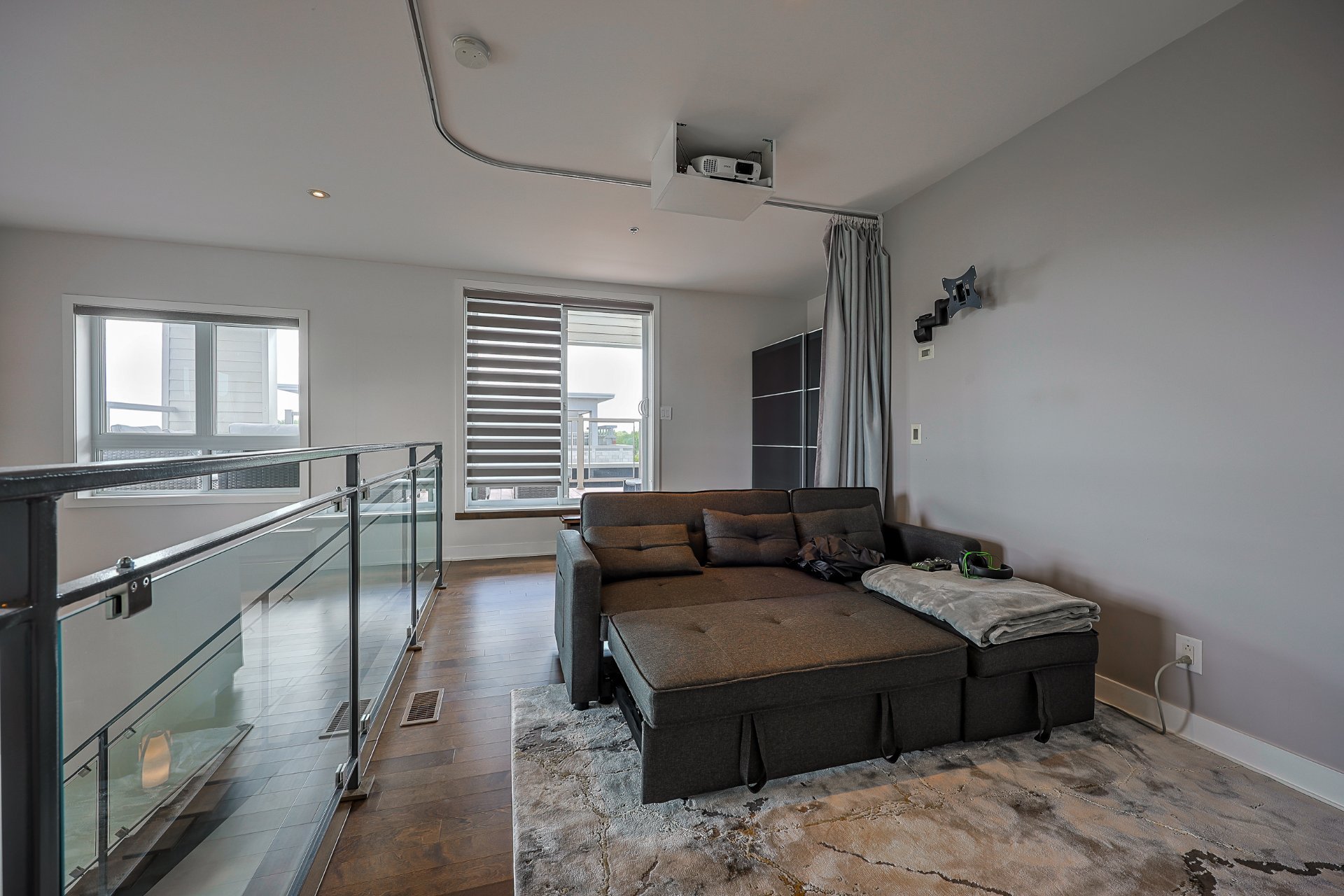 Stunning 2-bedroom condo, 2 garages with a mezzanine and private terrace featuring a spa. Open-concept design with 20-ft ceilings floods the space with natural light. Fully furnished, ready for immediate move-in. Secure complex offers a pool, gym, and garage with an electric car charging station. Elegant kitchen with quartz countertops, 2 modern bathrooms. Close to Méga-Centre Notre-Dame and Highway 13, just 5 min from Montreal. A must-see!