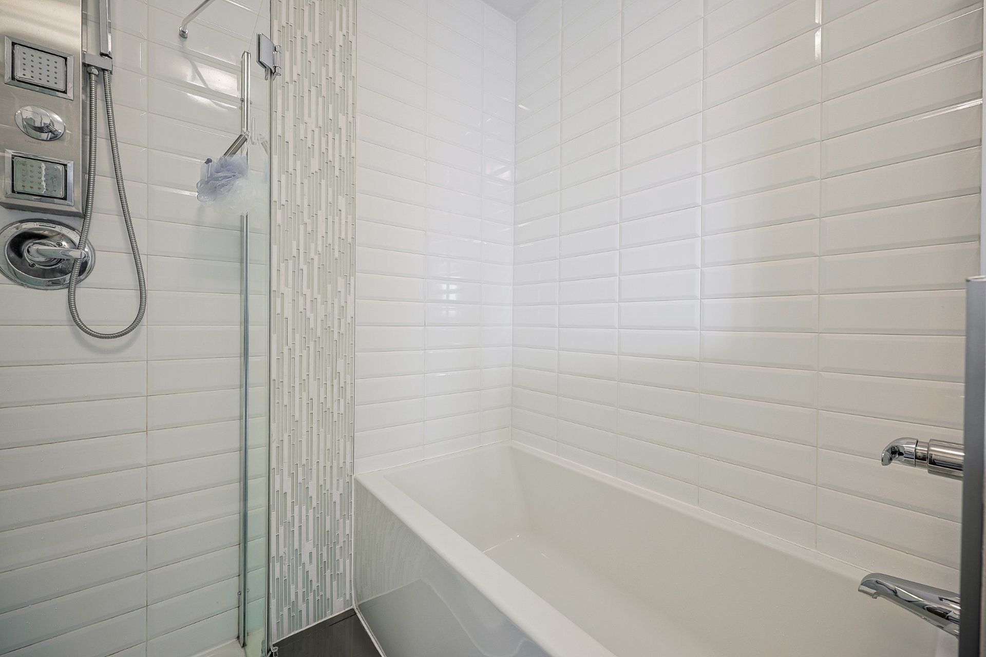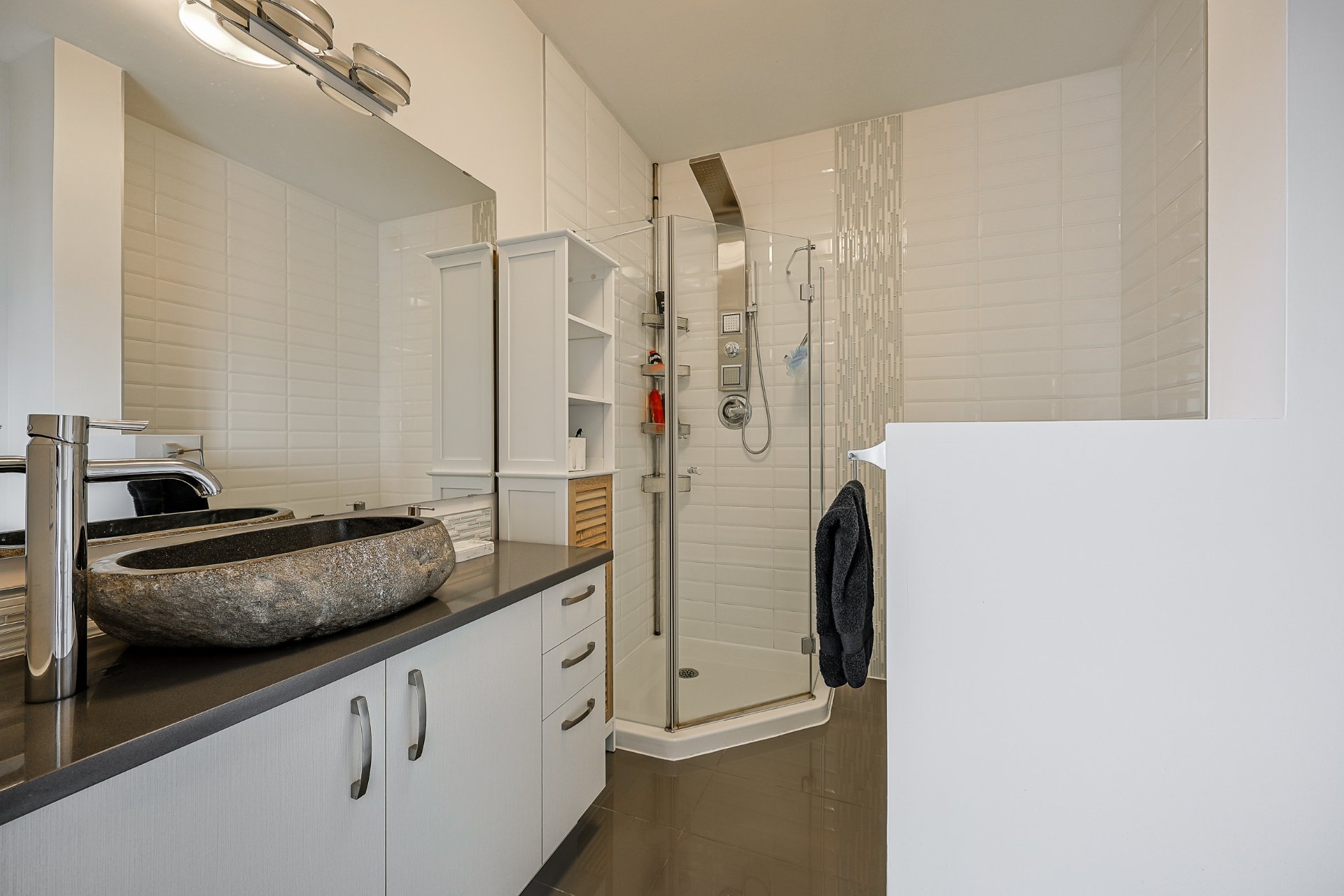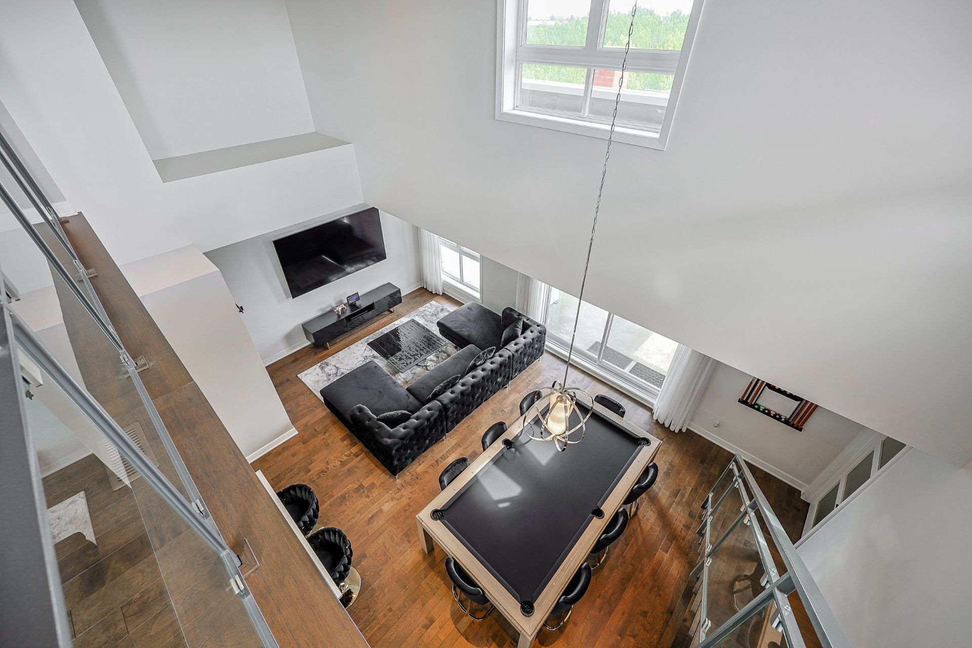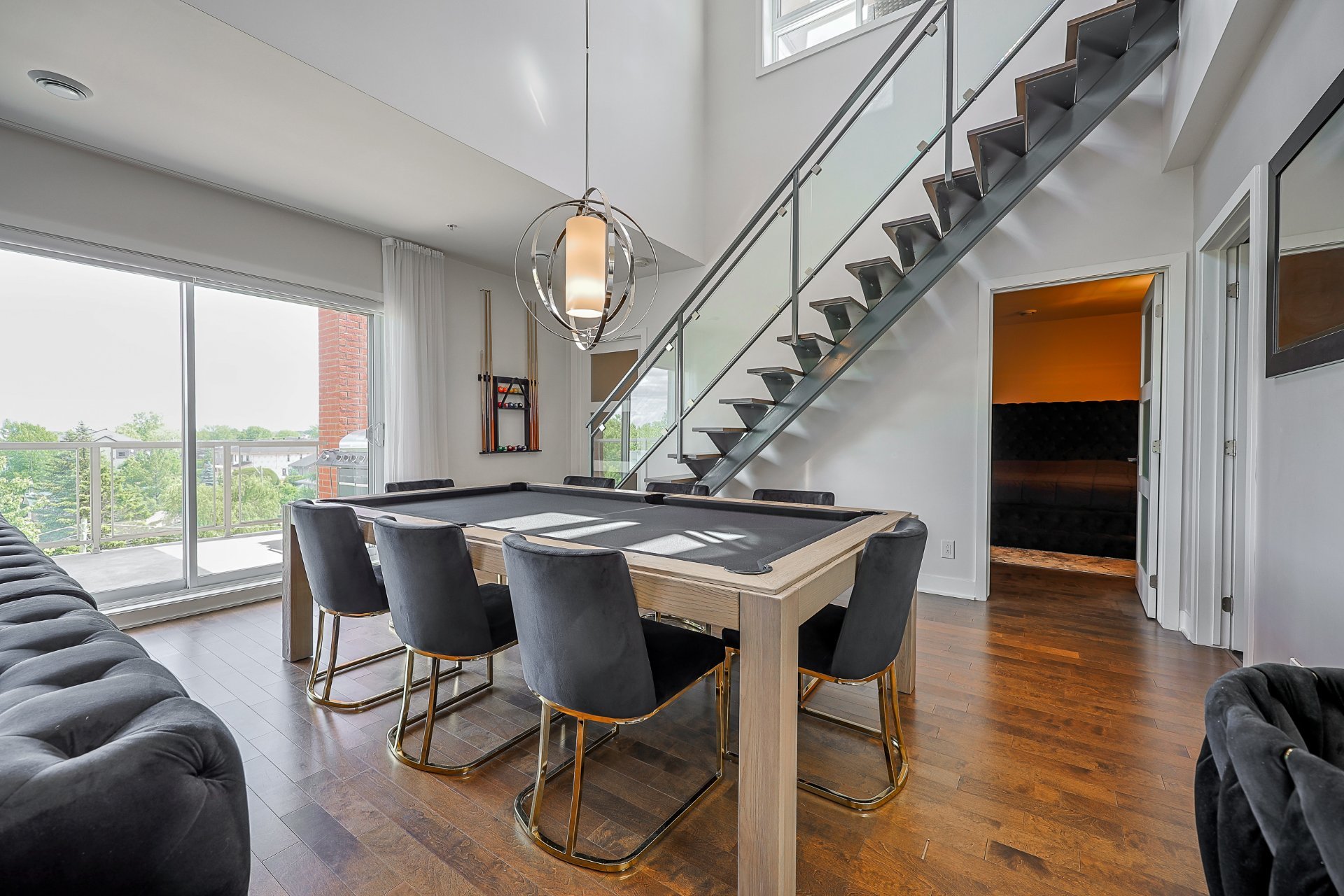 Stunning 2-bedroom condo, 2 garages with a mezzanine and private terrace featuring a spa. Open-concept design with 20-ft ceilings floods the space with natural light. Fully furnished, ready for immediate move-in. Secure complex offers a pool, gym, and garage with an electric car charging station. Elegant kitchen with quartz countertops, 2 modern bathrooms. Close to Méga-Centre Notre-Dame and Highway 13, just 5 min from Montreal. A must-see!